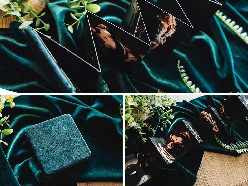 A true client favourite! This stunning velvet accordion book may be small but it’s impact is mighty. You can display a mixture of both portrait and landscape images printed on both sides and your photos will be secured by a magnetic seal inside the hardcover. Included as an option in a package or available to add on.