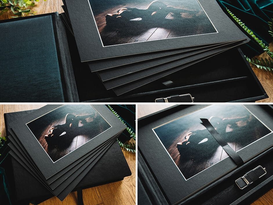 This beautiful winged folio is the most gorgeous way to present your three favourite images. It’s available for portrait or landscape images with a range of interior layout options. It folds away for presenting as a gift and looks wonderful opened out on display. Included as an option in a package or available to add on.