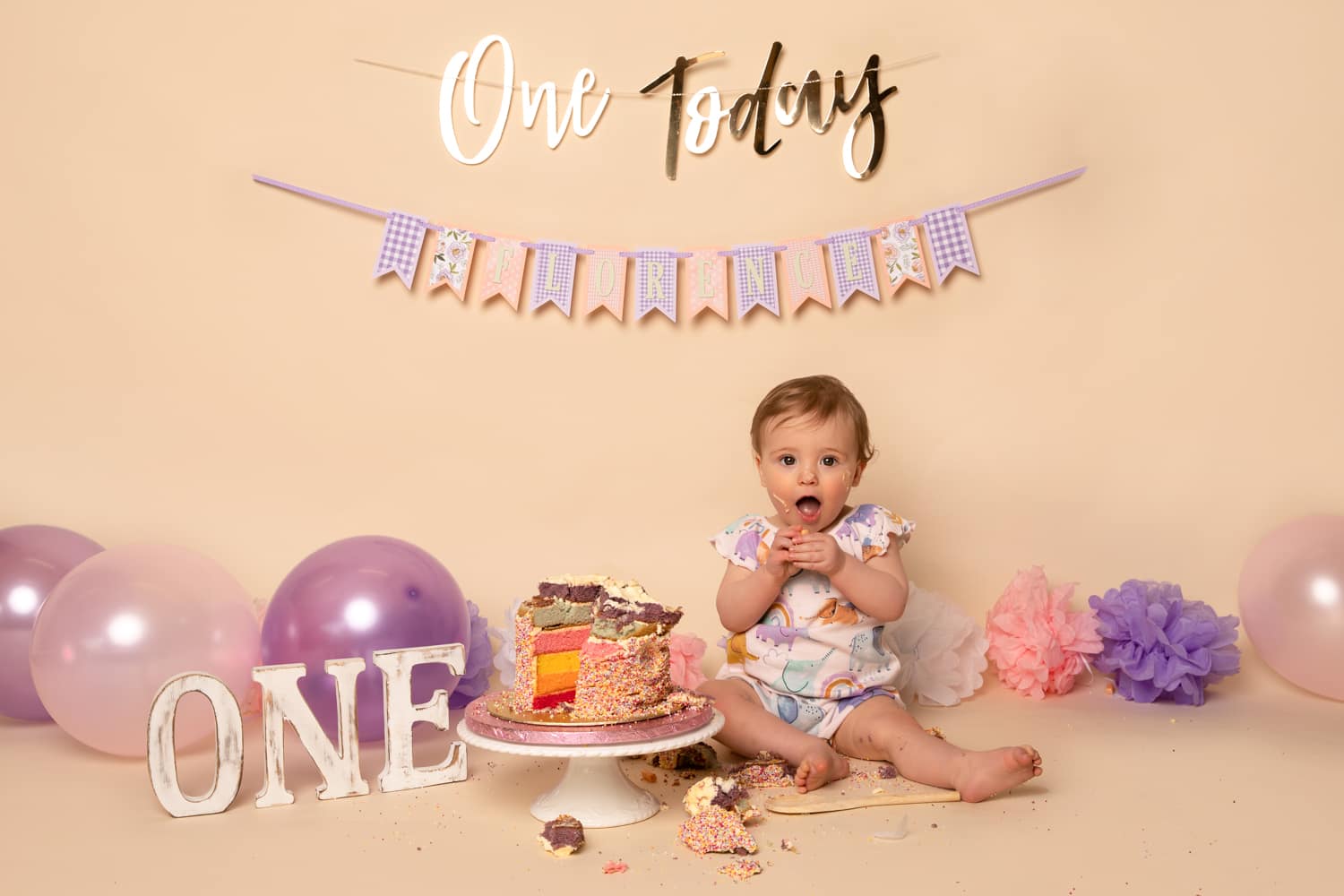 The grey or cream plain paper backdrops can be customised with colours of your choice in terms of balloons, pom pom and banners. The other backdrops are printed as a set design and can’t be changed, however accessories such as balloons/ONE letters can be added.